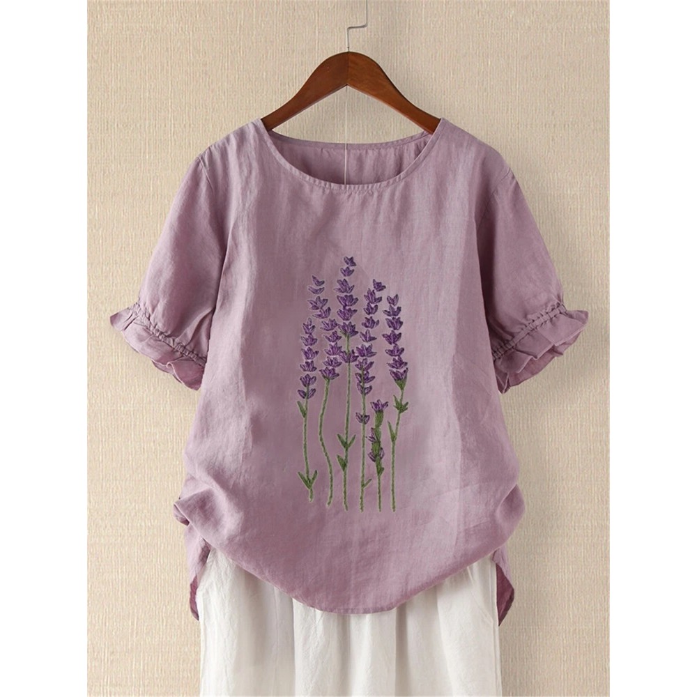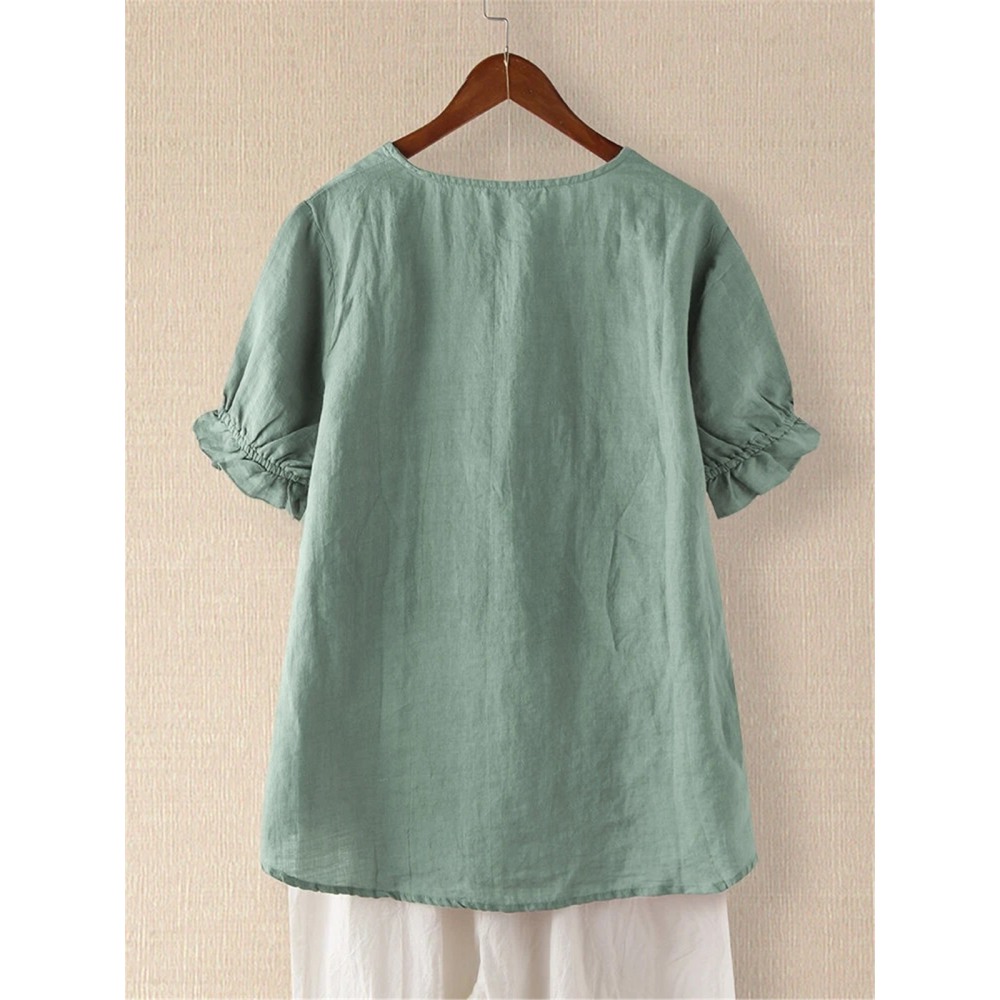 New Literary Retro Golden Embroidery Imitation Cotton Linen Pullover Cotton Short Sleeve T-Shirt Women Loose Top